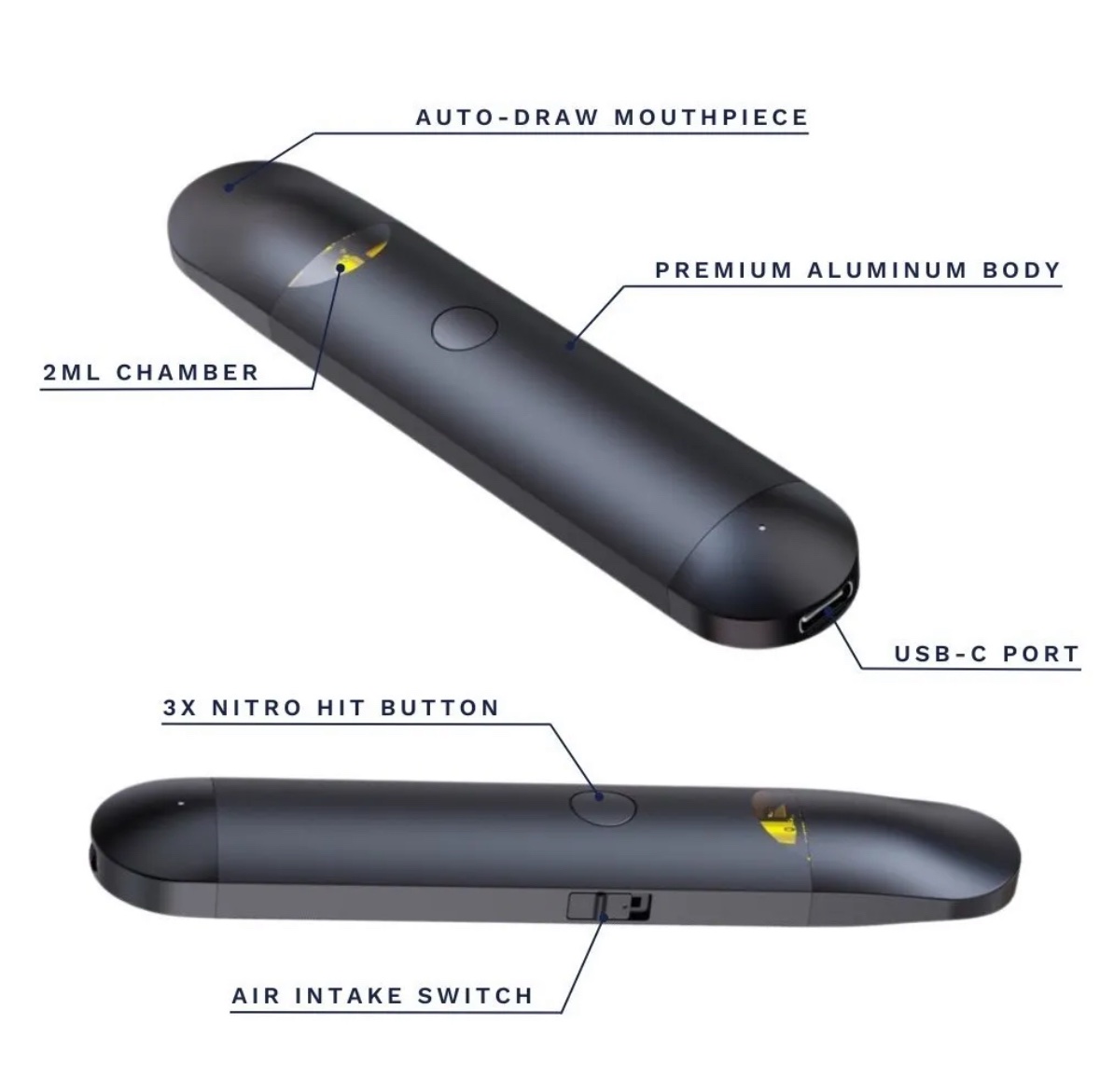 Featuring an integrated Nitro Button, this device delivers up to 3X the hit when you want an extra boost, while the auto-draw function provides effortless activation for everyday sessions. Customize your airflow with the adjustable air-intake switch to match your preferred draw style, from smooth and light to bold and intense.